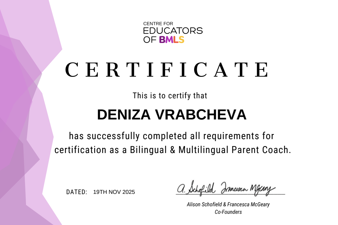 Today, I support families raising children in more than one language by offering evidence-based guidance, emotional reassurance, and practical strategies that fit real life.